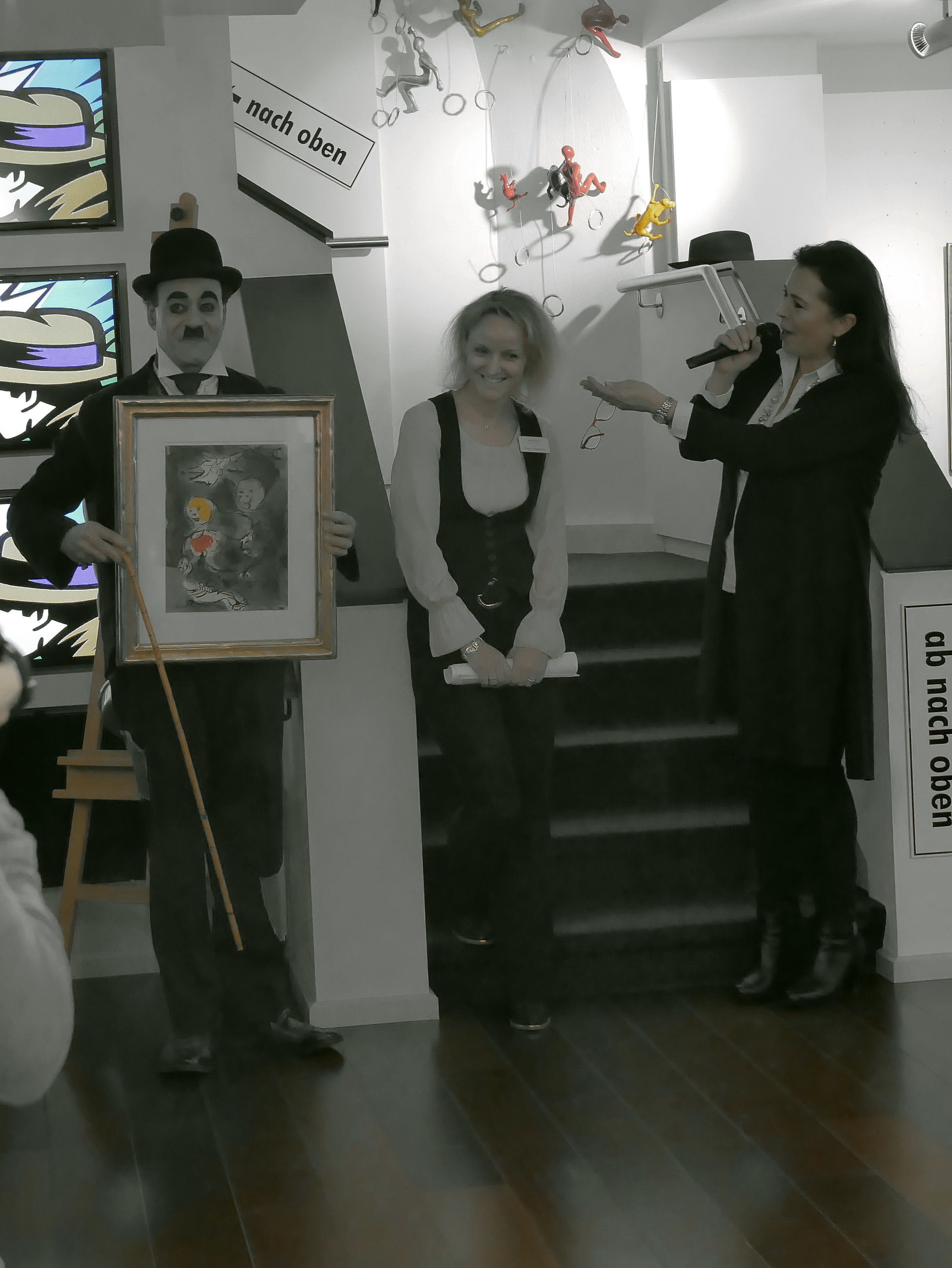 Er kennt kein Woher und kein Wohin. Er ist rundherum ganz und gar allein, ohne Vorprägung durch Nahes und Fernes. Er ist wie er ist, mit Stöckchen, zerschlissenen Schuhen und dem unverlierbarem Hut. Er geht ohne Ziel durch die Zeit, durch den Raum. Er kommt aus dem Märchen und kehrt wieder heim ins Märchen. Er treibt sich unter die Menschen umher wie ein Gentleman. Erleben Sie Charlie Chaplin deshalb bei allen Feiern und Veranstaltungen. |